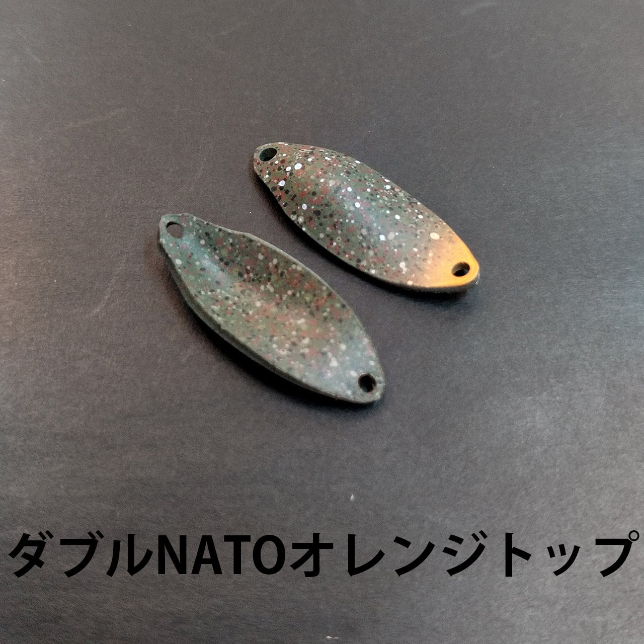 表裏ともにNATO迷彩(ダークオリーブをベースに、ブラウン、ライトオリーブ、ライトカーキ、ブラック飛ばし)で、表面にのみホワイトを飛ばしてトップを蛍光オレンジで仕上げました。