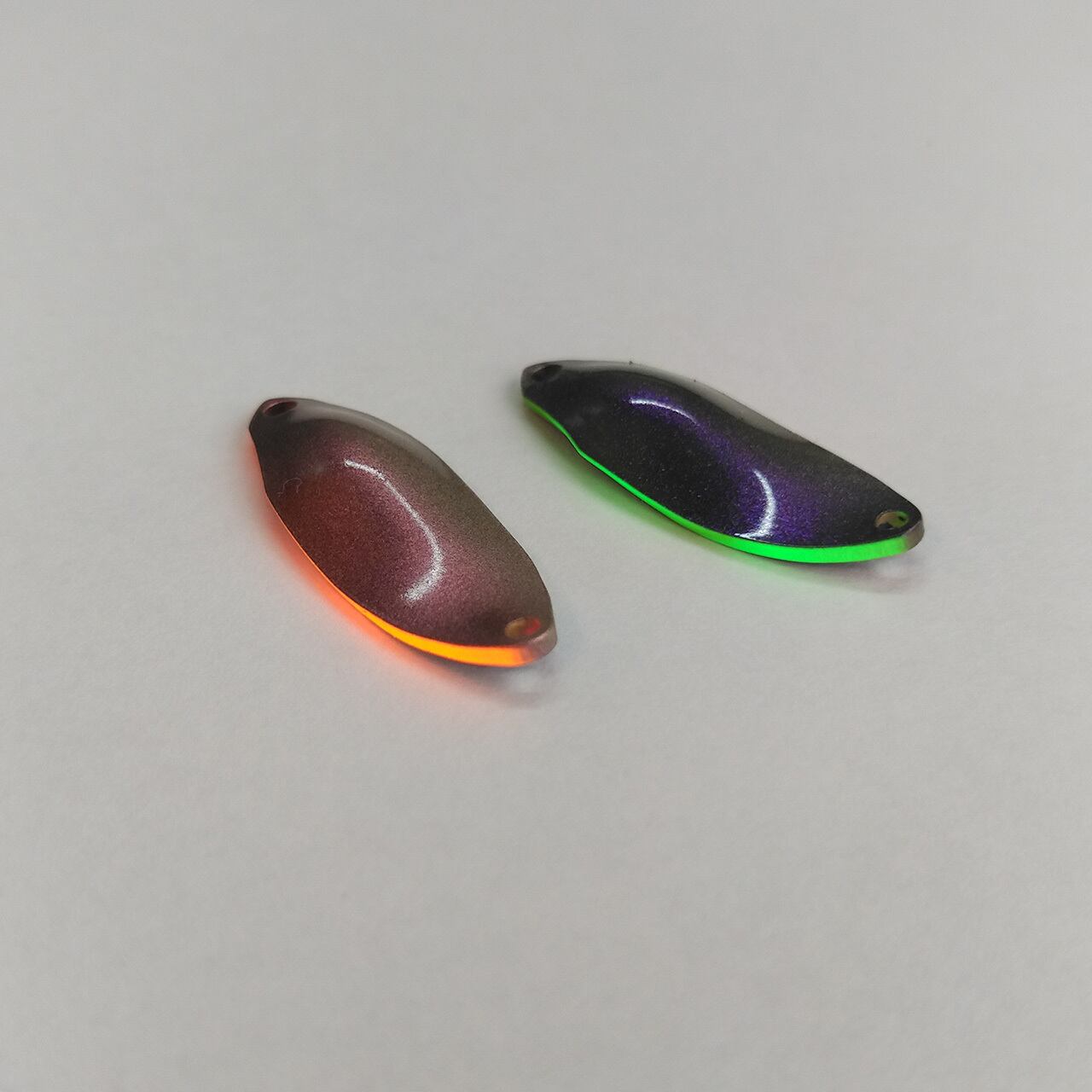 表はシャンパンゴールドとダークオリーブをベースにマジョーラ(アンドロメダ)でコート、順光ではグリーンに逆光ではパープルに粒子が反射します。片側サイドを蛍光グリーン、裏面はダークオリーブを艶消しで仕上げました。